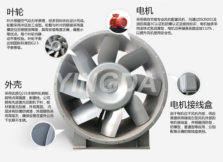 由于電機位于風機內部,供應商應提供將接線引至風機外部的電機接線盒,并根據消防型、防爆型、普通型等應用,分別配備正確的接線盒類型。